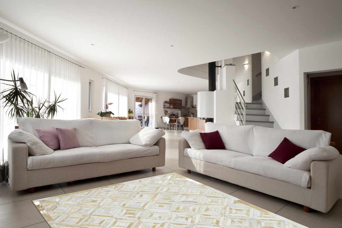 Der wunderschöne Lederteppich mit eingearbeiteten Applikationen aus metallischer Folie rundet jeden edlen Einrichtungsstil gekonnt ab. Der hochwertige Edel-Teppich aus 100 % Leder überträgt einen individuellen Touch auf seine Umgebung und erzeugt ein ganz besonderes Flair. Von Hand gefertigt ist jeder einzelne Lederteppich ein Unikat. Die Verwendung von edlen Naturmaterialien und die hochwertige Verarbeitung sorgen für ein dynamisches Aussehen und machen jeden Teppich einzigartig, denn bei Naturprodukten kann es in Form, Farbe und Muster zu Abweichungen von bis zu 30 % kommen. Das natürliche Fell kann nach einiger Zeit und bei hoher Beanspruchung gegebenenfalls an Haaren verlieren. Ebenso könnte sich die Metallicfolie unter Umständen ablösen. Dies ist dem Naturprodukt und der Beschaffenheit des Fells geschuldet und kein Produktionsfehler. Setzen Sie ein Statement mit diesem Lederteppich und machen Sie ihn zum Blickfang in Ihren vier Wänden. Er eignet sich für alle Räumlichkeiten - ob Wohnzimmer, Schlafzimmer, Diele oder Esszimmer. Das moderne filigrane Rautenmuster verleiht dem Produkt eine ganz besondere Note und kommt in Kombination mit verschiedenen Möbeln gut zur Geltung. Naturfaser-Teppiche fangen Fusselwolken ein und sind daher besonders gut für Allergiker geeignet, da sie gleich abgesaugt werden können. Der extra bequeme Lederteppich ist ein Alleskönner, der sowohl durch seine Optik als auch durch seine Haptik überzeugt. Das strapazierfähige Material macht die schwere Qualität des Teppichs aus, ist äußerst langlebig und pflegeleicht. Für einen spürbaren Wohlfühl-Effekt sorgt dabei die wärmeisolierende Eigenschaft des Leders. Verleihen Sie Ihren Räumen das gewisse Etwas und schaffen Sie Ihre eigene Relax-Insel in verschiedenen Nuancen. Selbst die kleinste Wohnung lässt sich mit diesem wundervollen Naturteppich persönlich einrichten, denn er ist in verschiedenen Größen erhältlich.