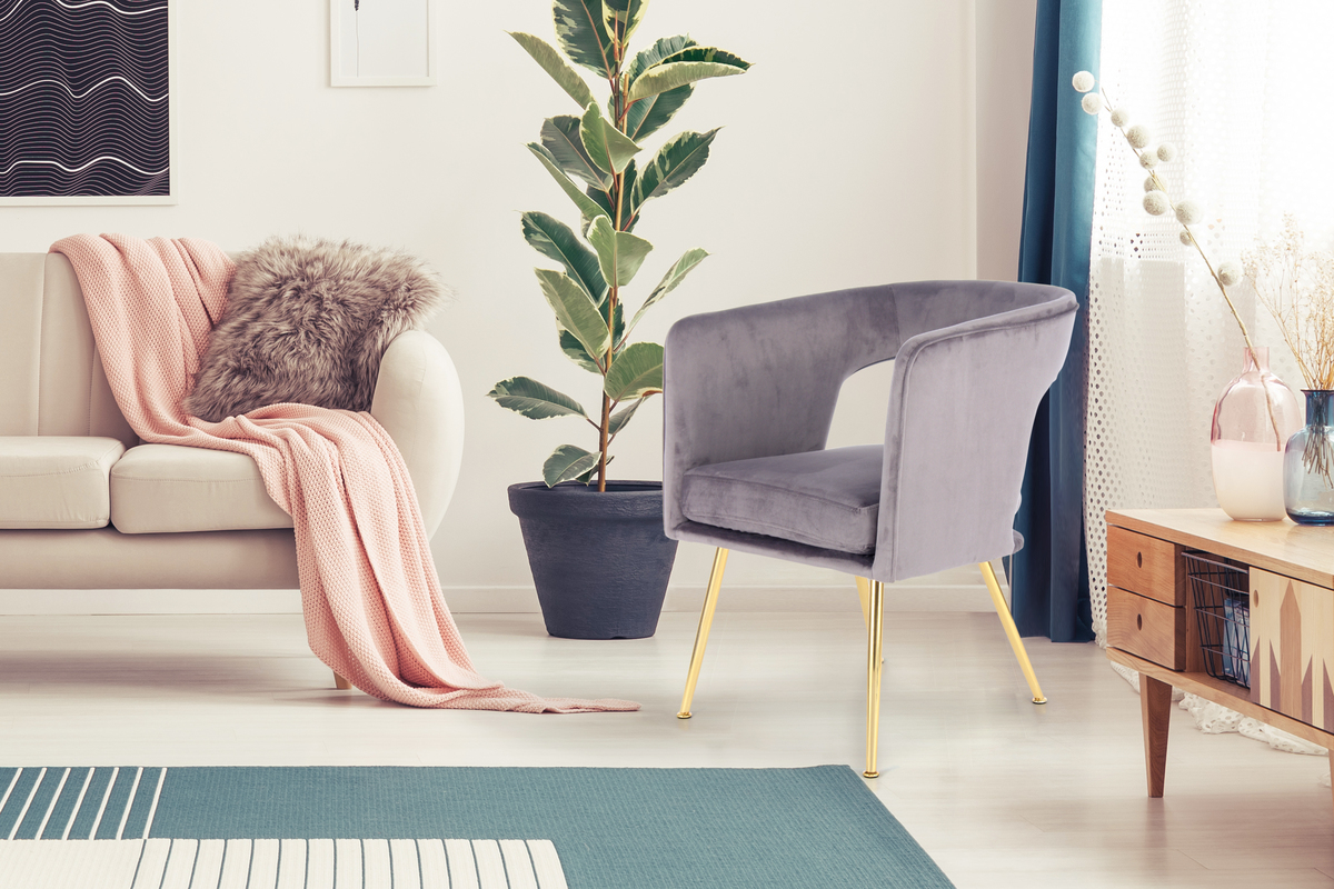 Dieses Stuhlmodell ist zeitlos und vermittelt dennoch einen Retro-Charakter. Die würfelförmige Grundform wird durch abgerundete Kanten und Ecken und eine Aussparung in der Mitte der Rückenlehne zu einem besonderen Hingucker. Der samtweiche Bezug in unifarbener Gestaltung unterstreicht den Retro-Look des Stuhls ebenso wie die seitlich abgespreizten Stuhlbeine aus Metall. Für Sitzkomfort sorgen das dicke Sitzkissen sowie die Rückenlehne mit integrierten Armlehnen. Das Sitzkissen ist durch Klettverschluss mit der Sitzschale verbunden und ist an der Unterseite mit einem Reißverschluss versehen. In der Leseecke kann der Stuhl als Einzelstück als gemütliche Sitzgelegenheit dienen. Kombiniert mit einer passenden Leselampe und einem kleinen Beistelltisch als Ablagefläche können Sie sich Ihre persönliche Leseecke stilvoll einrichten. Aber auch am Esstisch macht der Stuhl in gruppenweiser Anordnung eine gute Figur. Bestellen Sie einen oder mehrere Stühle für sich selbst und Ihre Gäste und genießen Sie das neu gewonnene Ambiente. Der Stuhl kann in seiner tatsächlichen Farbgebung von den Bildern abweichen. Durch unterschiedlichen Lichteinfall und verschiedene Streichrichtungen des Stoffbezuges können unterschiedliche Farbnuancen entstehen.