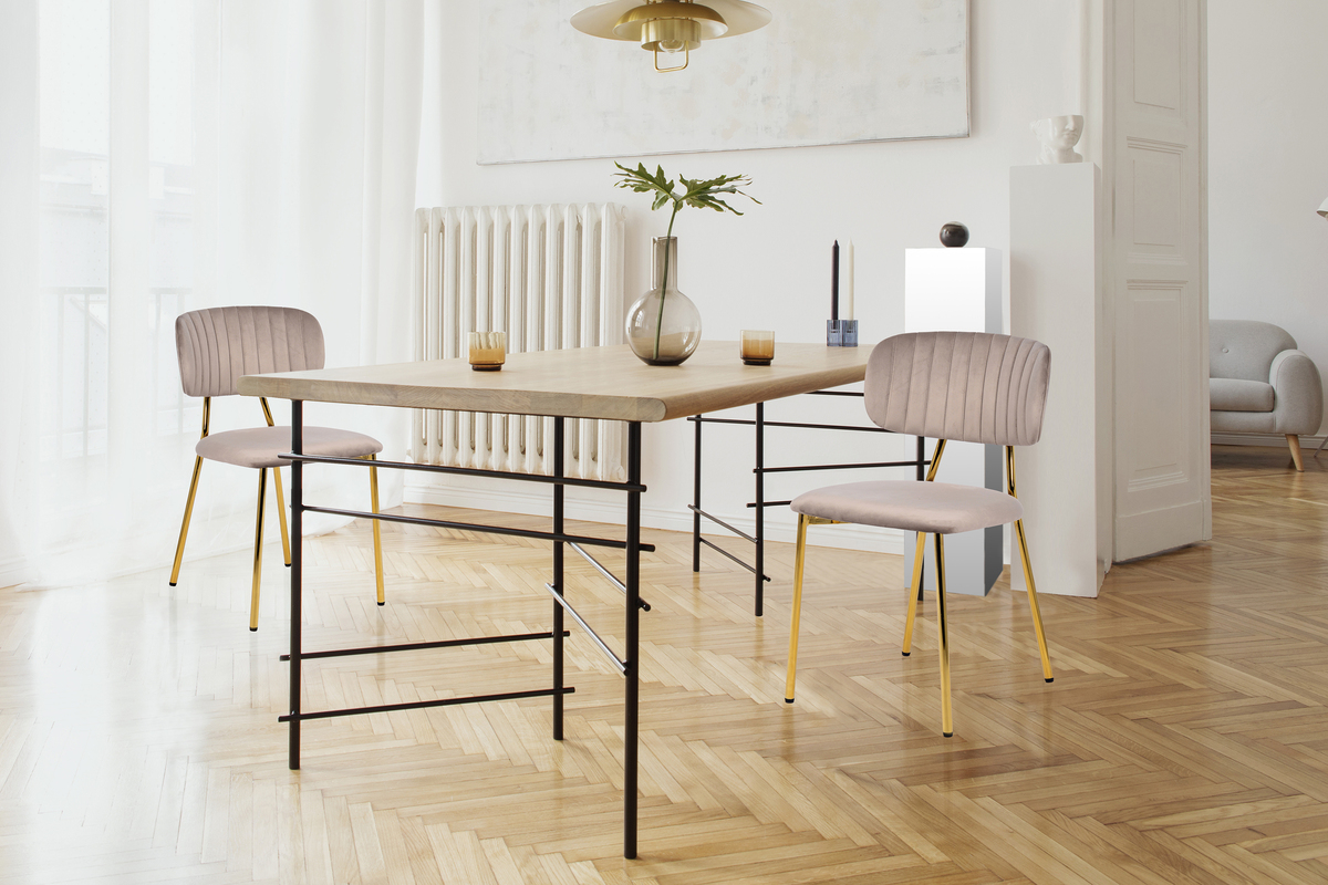 Gleich 2 ausgefallene Stühle in filigranem Design bekommt man mit diesem Set. An dem feinen Gestell aus Edelstahl sind die gepolsterte Sitzfläche und die gepolsterte Rückenlehne angebracht. Hier ist das Motto: Weniger ist mehr: Die Stühle sind platzsparend, überzeugen aber dennoch durch ihr ausgeklügeltes Design und die bequemen Polstern. Die Ziehrnähte auf der Rückenlehne unterstreichen das Design gekonnt. - Stoffbezug aus Samt - Auswahl aus vier Pastellfarben - stabiles Gestell aus Edelstahl - praktisches 2er-Set