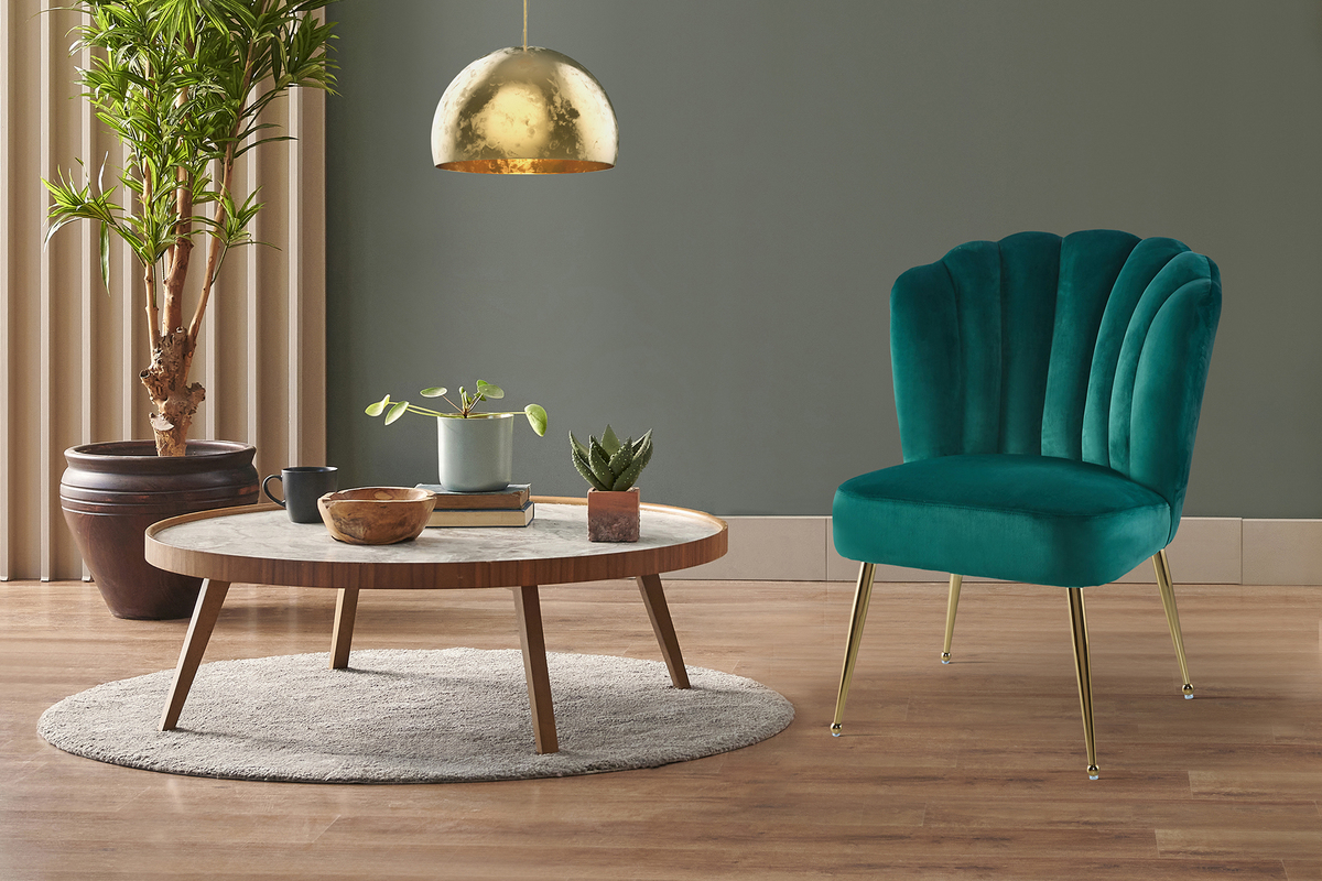 | Besonderheiten: | Samt-Polsterstuhl, goldfarbene Metallbeine, Rückenlehne in Muschel-Design |