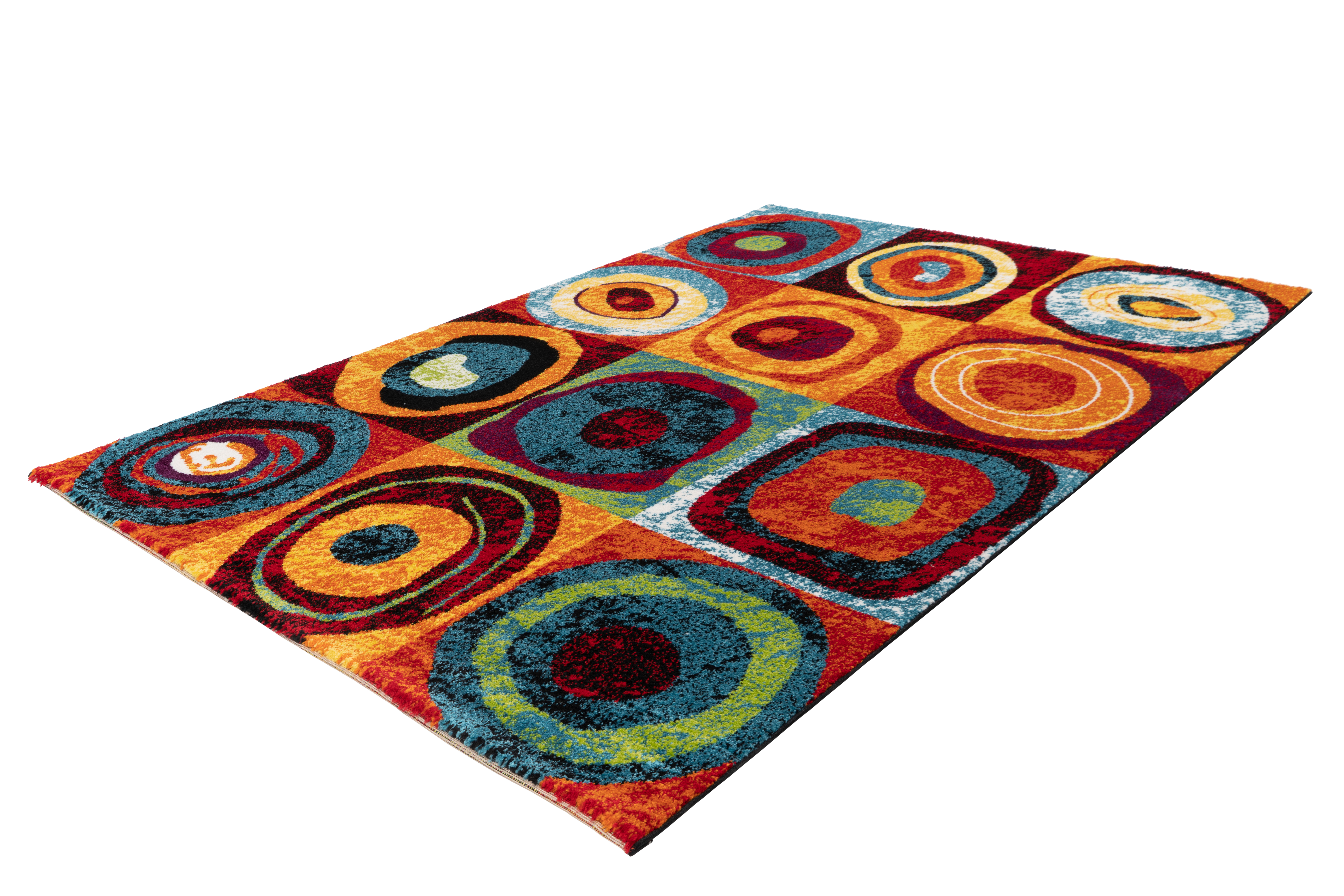 Ein kunstvolles Teppichwunder, das auf den Boden gehört, erschaffen durch die Hand einer wahren Koryphäe seines Gebietes. Ein gewaltiges Farbspektrum in einer Explosion an Kreativität. Dieser ausgefallene Designer-Teppich erfreut mit einer außerordentlich ausgewählten Farbkomposition. Ein farbenfrohes Kunstwerk das 100%ige Aufmerksamkeit verdient und auch erhält. Der elegante "Graphic-Carpet" zeichnet sich durch seine besondere Ausstrahlung aus. Der designstarke Teppich steckt voller Esprit und verlockt zu Inspiration. Die energiegeladenen Farben regen neue Impulse an. Die brillant leuchtenden Farben erzeugen ein designorientiertes Ambiente. So harmoniert er mit jeder modernen, wie auch klassischen Einrichtung. Der dichte Flor schützt die Farben vor Ausblassung. Durch die strapazierfähige Kunstfaser werden Sie lange Freude an diesem Teppich-Kunstwerk haben. Dabei steht der Komfort stets im Vordergrund. Dieser trendige Teppich mit seinen warmen Farben wird schnell zu einem Blickfang in jedem Raum. Mit abwaschbarer Kunstfaser und seitlich gekettelt, eignet er sich zudem für beheizte Fußböden.