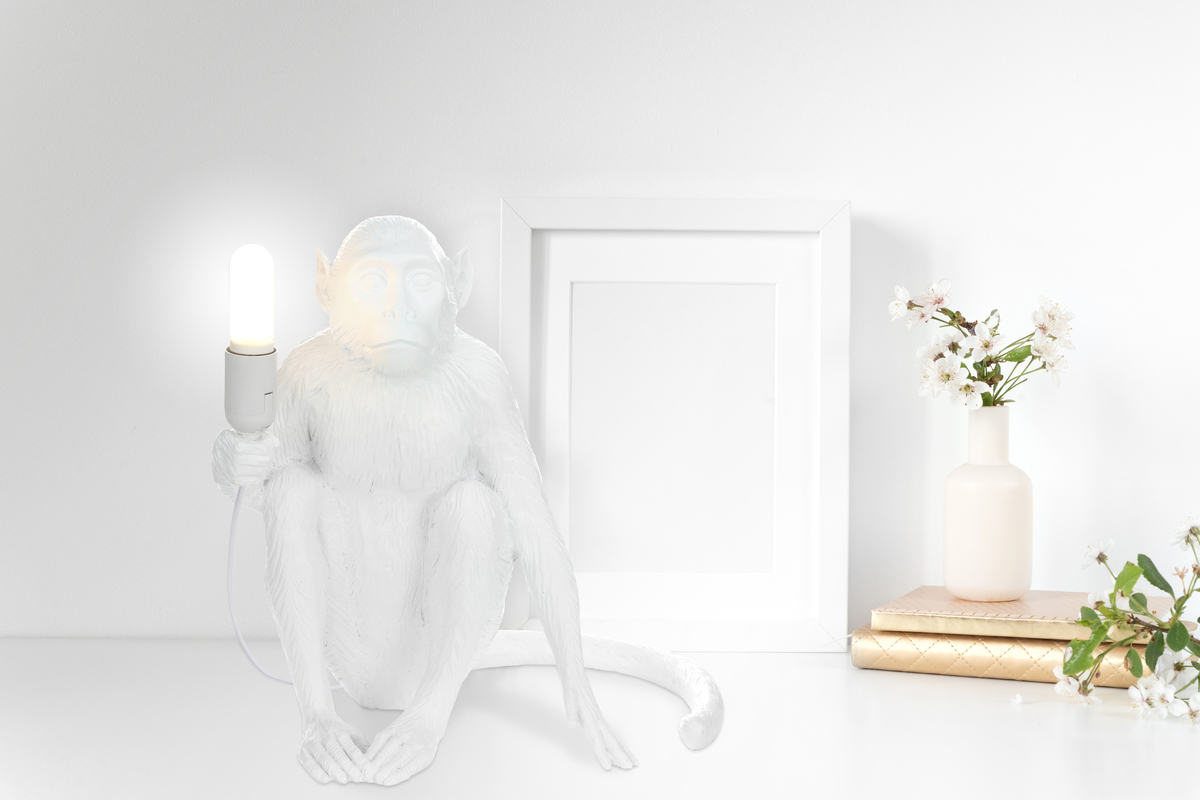 Stellen Sie die Affenfigur auf einen kleinen Beistelltisch oder auf ein Regal und nutzen Sie sie je nach Bedarf als Lampe oder Deko.