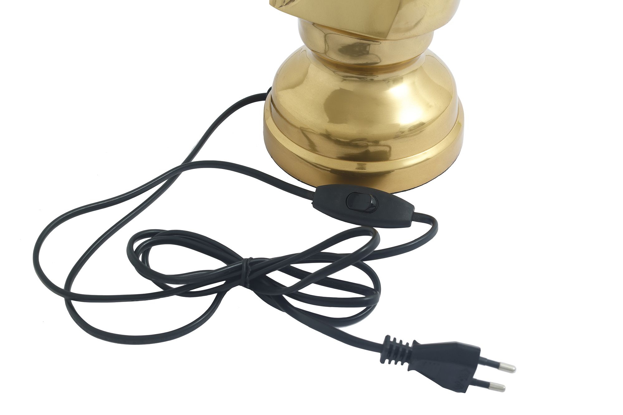 Im Mittelpunkt steht der auffällige Metall-Sockel, welcher der Pferd-Schachfigur nachempfunden ist. Der goldfarbene