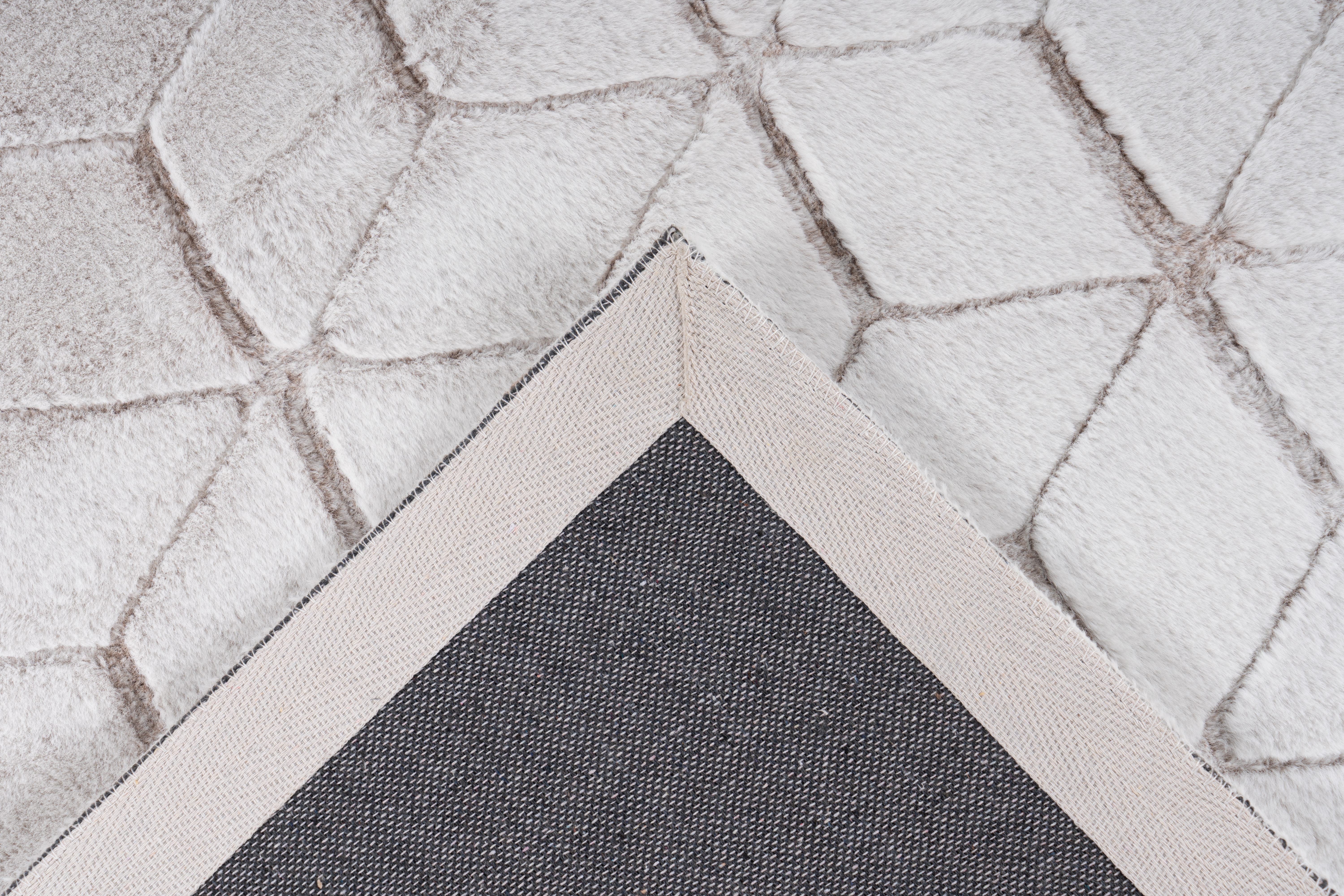 Der besondere Look dieses Hochflorteppichs zeichnet sich durch das attraktive geprägte Muster aus, das für einen attraktiven 3D-Effekt sorgt. Durch die geometrischen Formen des Musters erhält der Teppich zudem einen stilvollen Retro-Charakter. Der ansonsten schlichte und einfarbige Flor kann sich in jedem Wohnraum sehen lassen und lässt sich dank der schlichten Eleganz mit jeder Einrichtung kombinieren. Die kuschelige Oberfläche sorgt für eine gemütliche Atmosphäre im Raum. In Räumen mit Fußbodenheizung kann der Teppich ebenso problemlos ausgelegt werden. Durch einen Rücken aus Baumwolle und die Ziernaht rundherum wird der Teppichflor verstärkt. Gleichzeitig wird ein Ausfransen des Teppichs durch die Kettelung verhindert. Der Teppich kann in seiner tatsächlichen Farbgebung sowie im Muster von den Bildern abweichen. Der Teppich kann in seiner tatsächlichen Farbgebung abweichen. Durch unterschiedlichen Lichteinfall und verschiedene Streichrichtungen des Flors können unterschiedliche Farbnuancen entstehen.