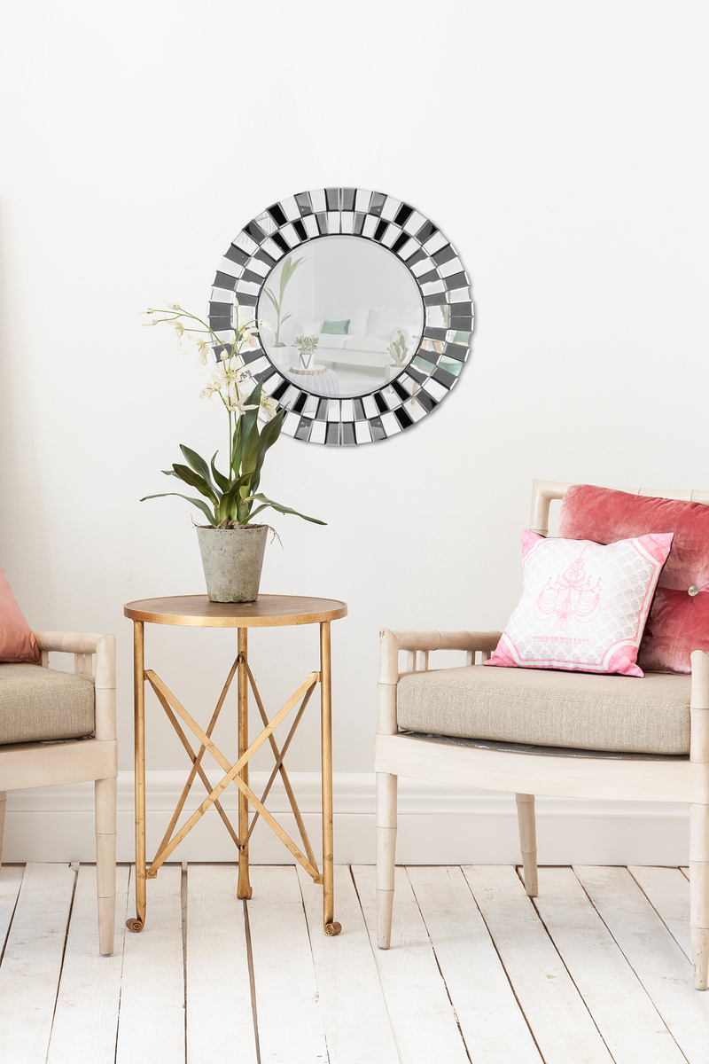 Dieser Spiegel bringt gehobene Eleganz in Ihre Räumlichkeiten. Die klassisch-runde Form der Spiegelfläche harmonisiert mit dem stilvollen Rahmen in Silber und Schwarz. Die leicht versetzt und im Wechsel angeordneten schwarzen und silbernen Elemente betonen den reizvollen Charakter des Wohnaccessoires. Der zeitlose Spiegel eignet sich ideal für die Anbringung im Wohnzimmer, Flur, Badezimmer oder jedem weiteren Raum. Kleine Räume profitieren von Spiegelflächen an der Wand, da sie diese größer erscheinen lassen. Mit einem Durchmesser von ca. 80 cm macht der silber-schwarze Spiegel besonders an freien Wänden etwas her. Auch als Geschenk für Freunde und Familie, egal ob zum Geburtstag, zur Einweihung oder für sich selbst, eignet sich der runde Wandspiegel ideal. Egal ob als auflockernde Dekoration oder als stylischer Hingucker – der runde Spiegel mit Silberrahmen glänzt prachtvoll und erhellt jeden Raum. Vereinen Sie den Deko-Zweck und den praktischen Nutzen des Deko-Spiegels miteinander und bringen Sie ihn an einer Wand in Ihrem Zuhause an. Er fügt sich dank der leichten Anbringung ideal in unterschiedlichste Wohnkonzepte ein. Kayoom ist bekannt für Designprodukte in stilvoller und eleganter Aufmachung für eine moderne Inneneinrichtung. Überzeugen Sie sich von uns und unseren Produkten. Your spot. Your home!