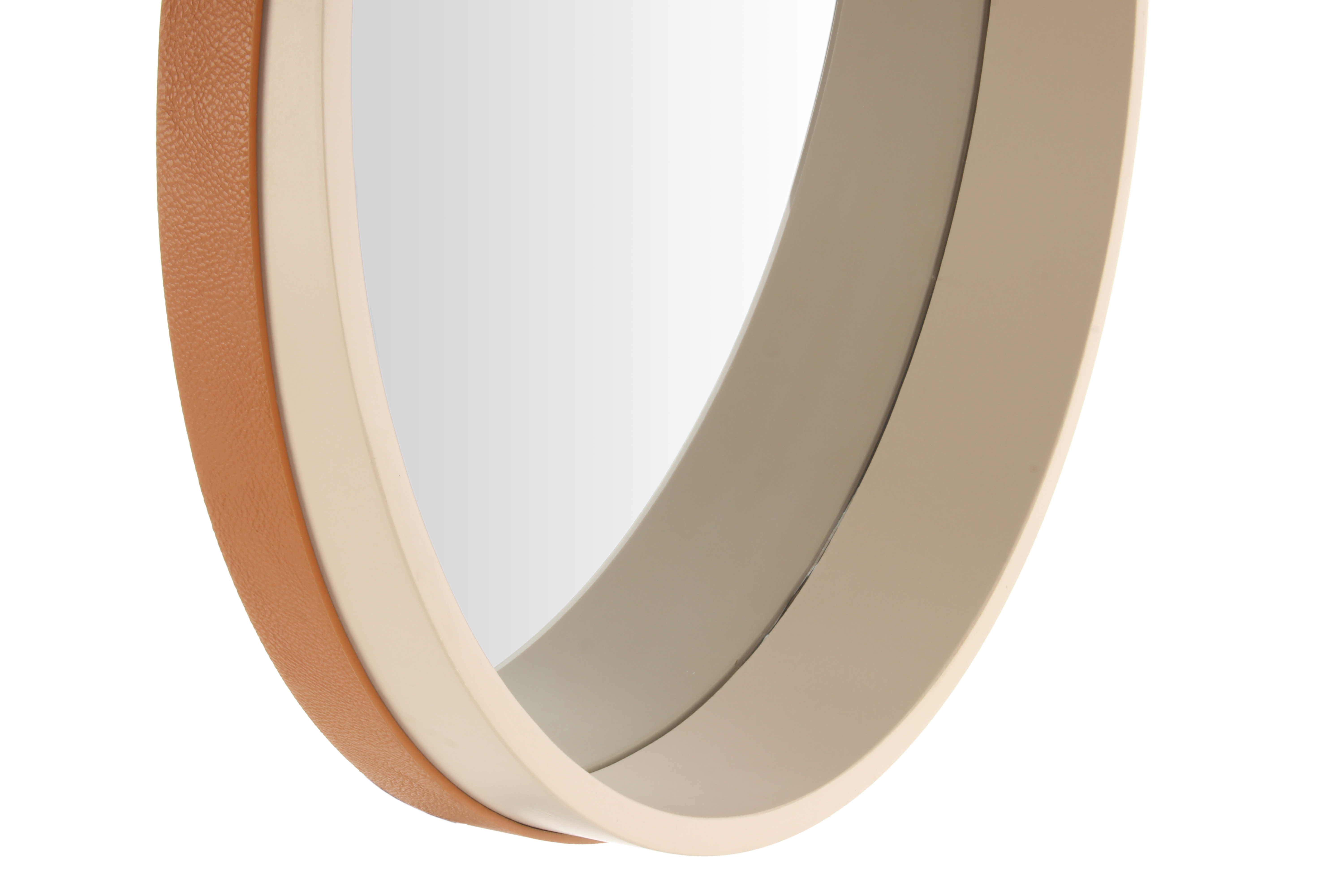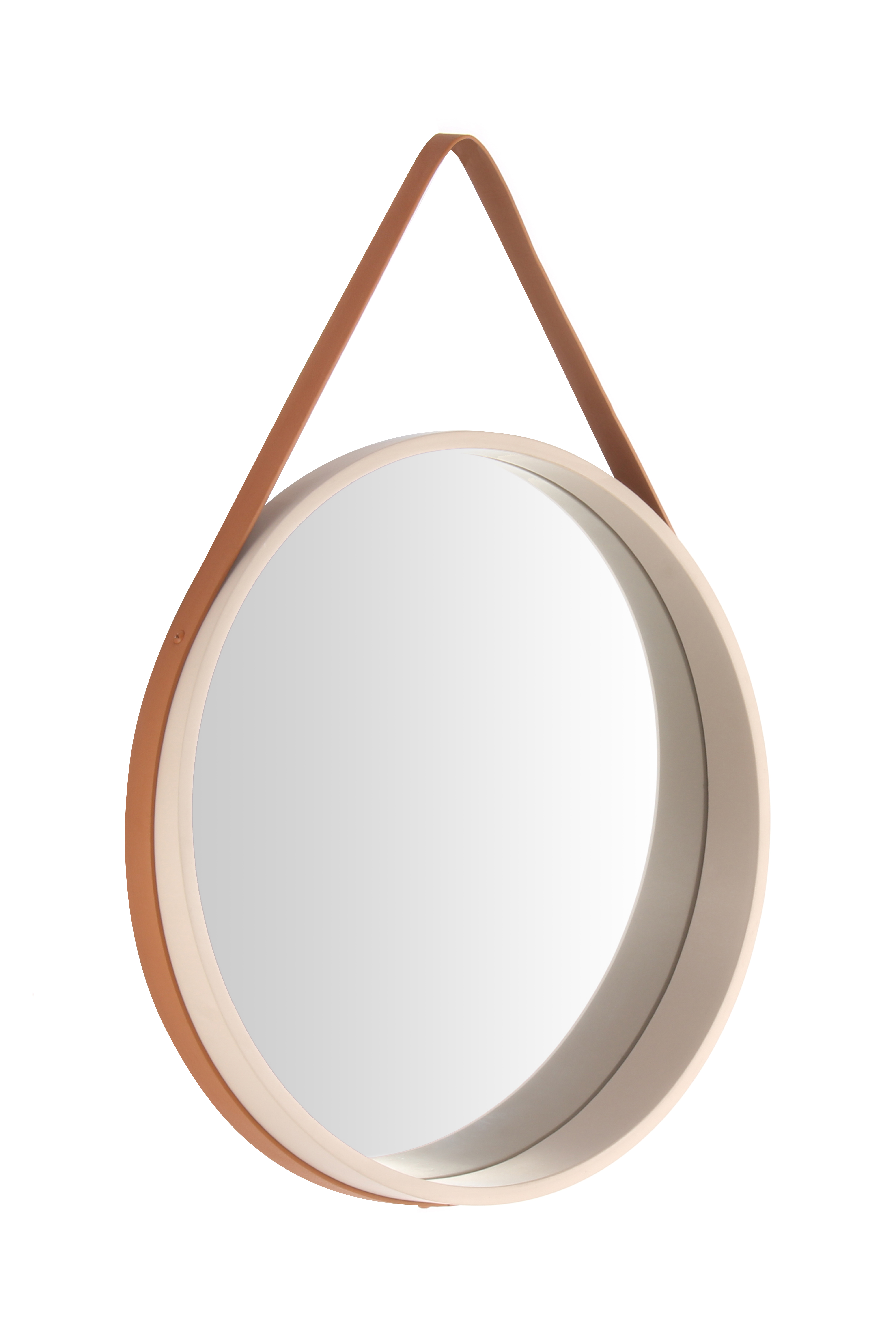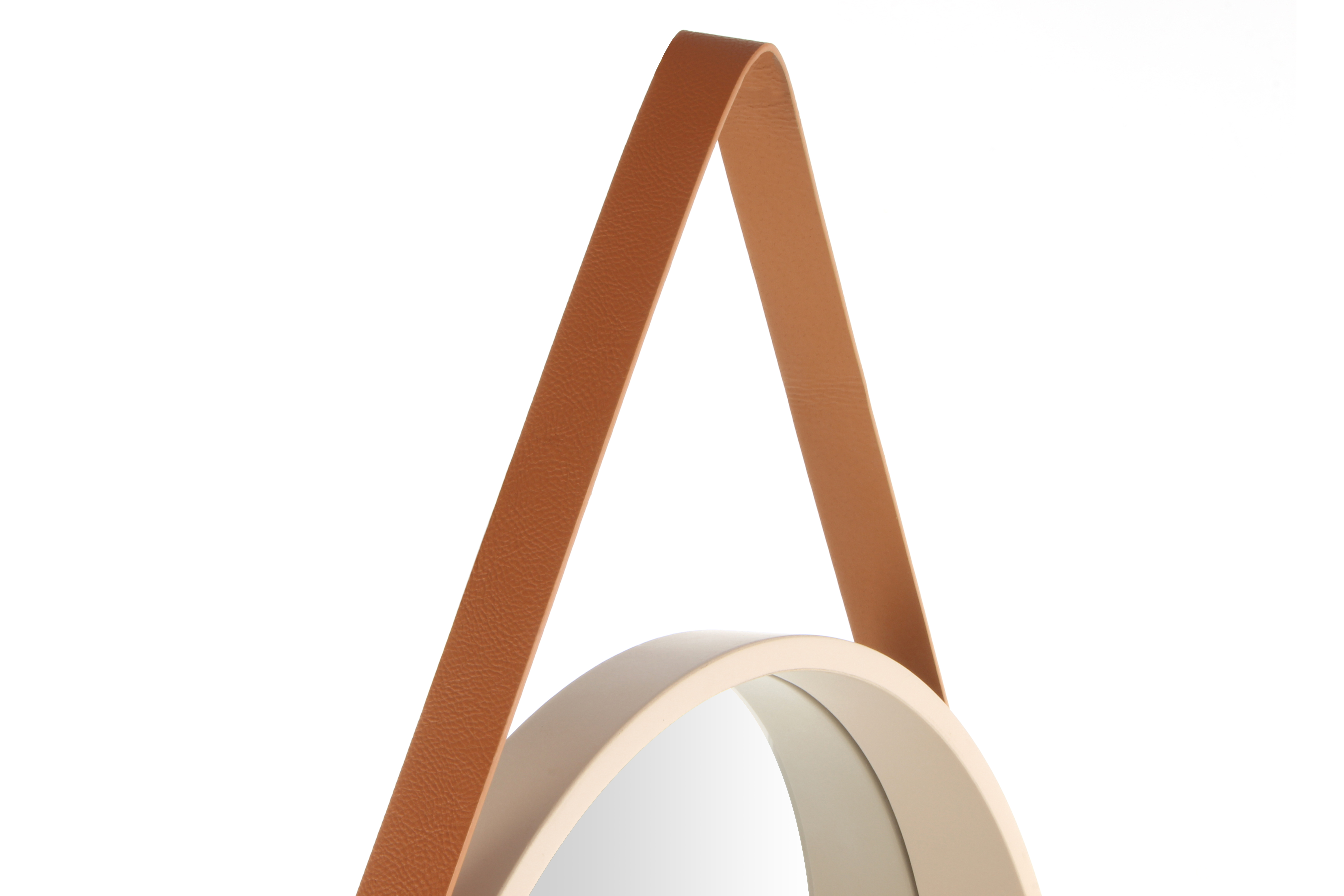 Bei diesem Spiegel erfolgt die Aufhängung an einem Gürtel aus Polyurethane. Der farblich passende Gürtel ist am äußeren Rahmen des Spiegels befestigt und macht den Spiegel durch die sichtbare und elegante Aufhängung zu einem besonderen Hingucker.