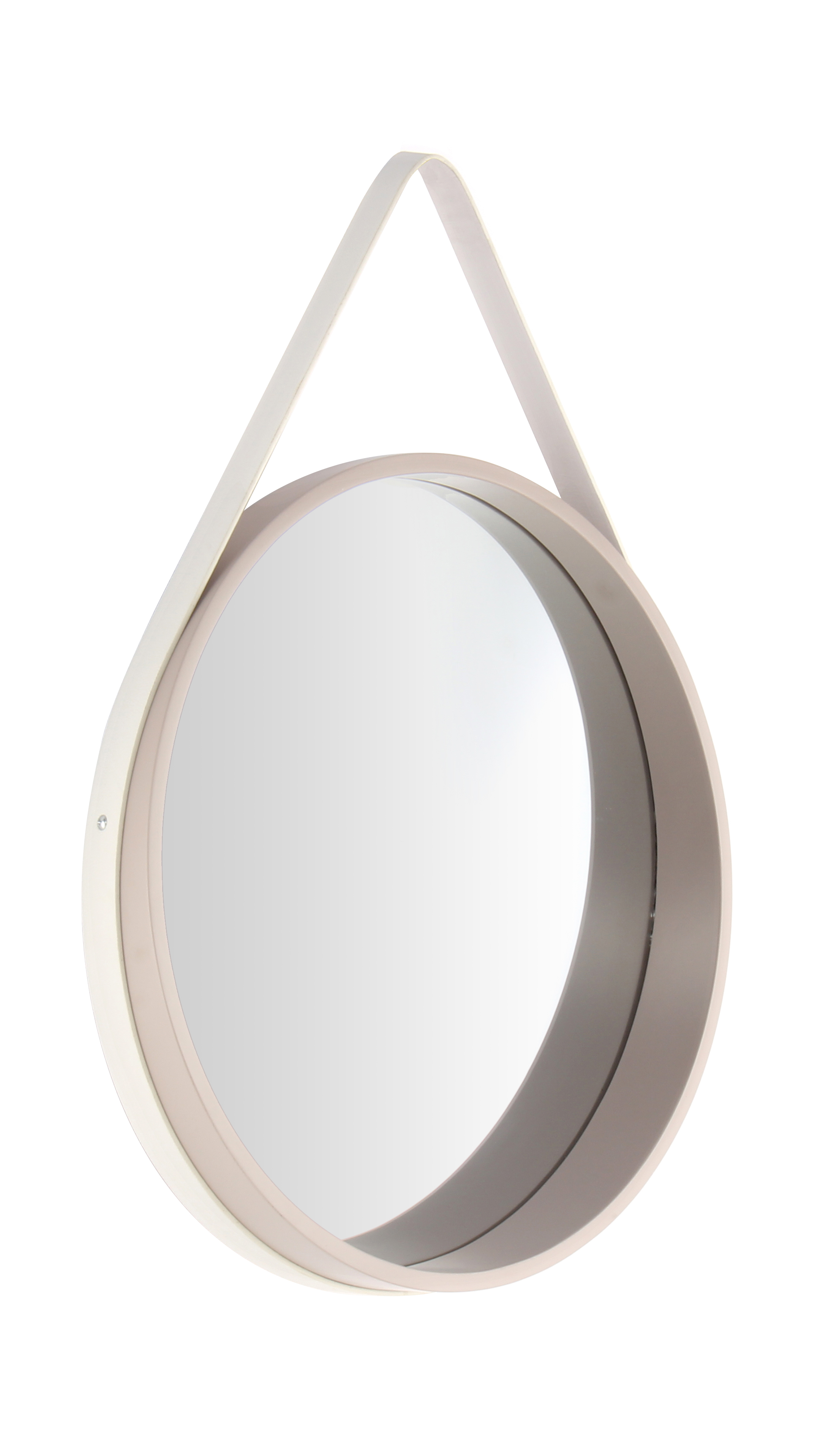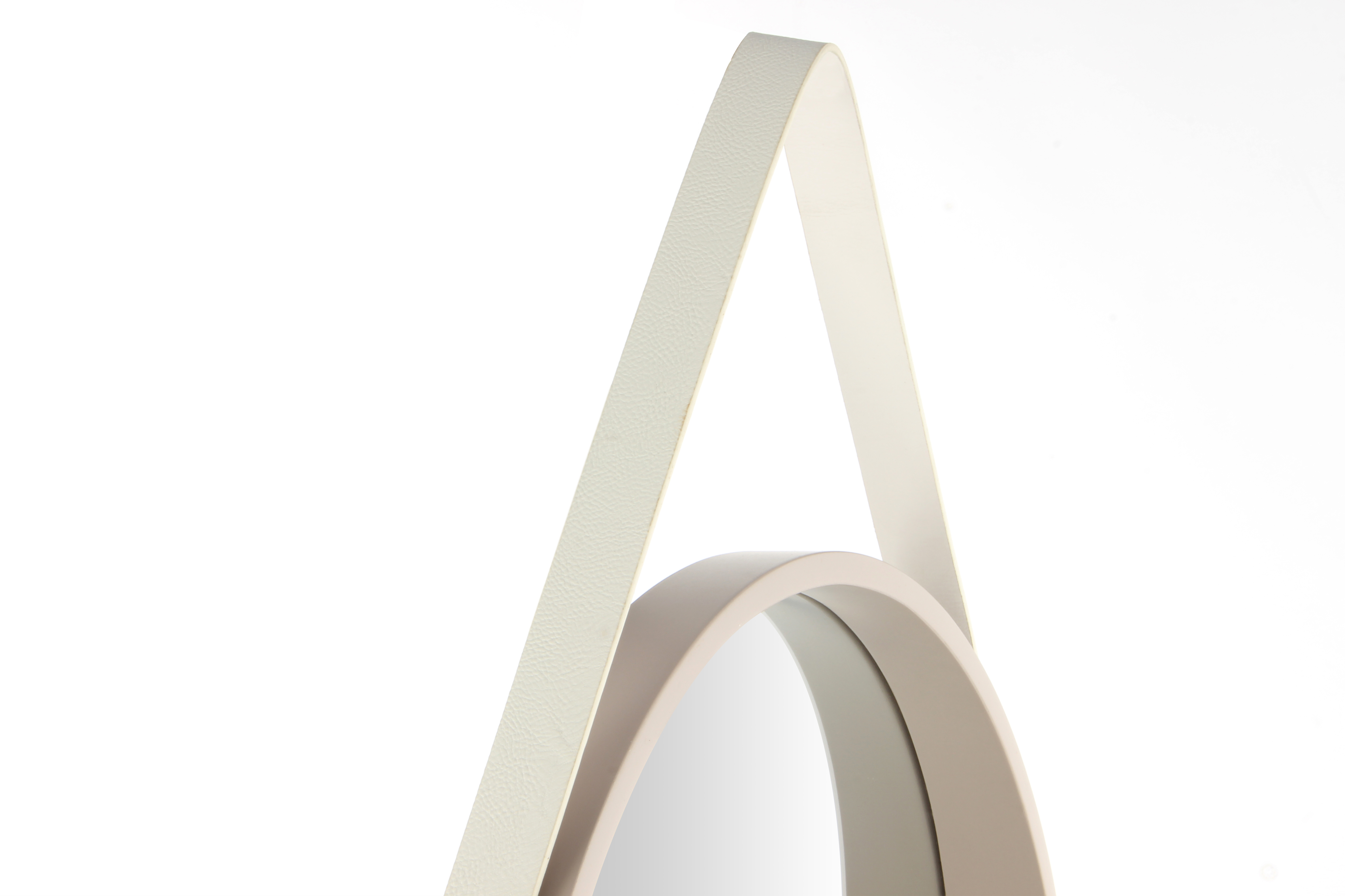 Bei diesem Spiegel erfolgt die Aufhängung an einem Gürtel aus Polyurethane. Der farblich passende Gürtel ist am äußeren Rahmen des Spiegels befestigt und macht den Spiegel durch die sichtbare und elegante Aufhängung zu einem besonderen Hingucker.