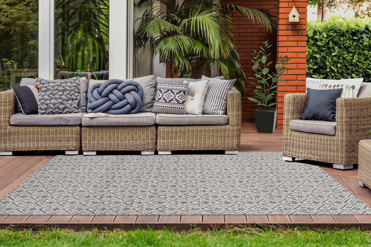 Mit diesem Teppich können Sie sich in Ihrem Außenbereich eine attraktive Wohlfühlzone einrichten. Besonders im Sommer eignet sich ein Outdoor-Teppich auf Balkon und Terrasse ideal, denn ein weicher Teppich unter den Füßen ist weitaus angenehmer als die aufgeheizten Bodenbeläge. Zudem eignet sich das Modell auch ideal als Ersatz für eine Decke. Legen Sie den Teppich einfach auf den Rasen, statten Sie ihn mit ein paar weichen Kissen aus und genießen Sie die Sonne im eigenen Außenbereich. Da sich der Teppich nicht so schnell aufheizt, kann er auch ideal als Spielteppich für die Kinder genutzt werden. Das Material ist robust und widerstandsfähig und wetterfest. Dank eines wasserdurchlässigen Rückens aus Latex kann sich keine Nässe auf der Oberfläche stauen, sodass der Teppich bei Wind und Wetter im Außenbereich liegen bleiben kann.